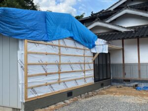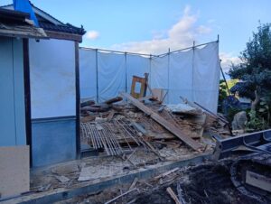 塀を部分解体し、屋根部分からつなぎ部分を保護しながら解体を進めました。